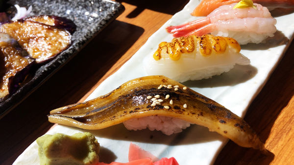 生魚片一定要從油脂含量少的先食用,慢慢品嘗生魚片的風味,從旗魚開始一直到鰻魚。握壽司醋飯帶點酸甜滋味相當開胃,而且米飯不會過於扎實,入口馬上散開跟生魚片融合在一起。