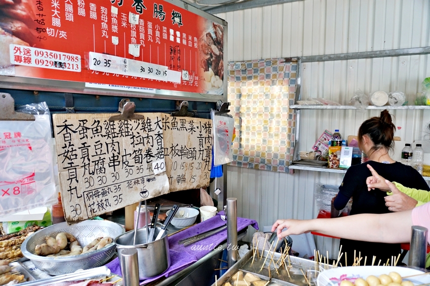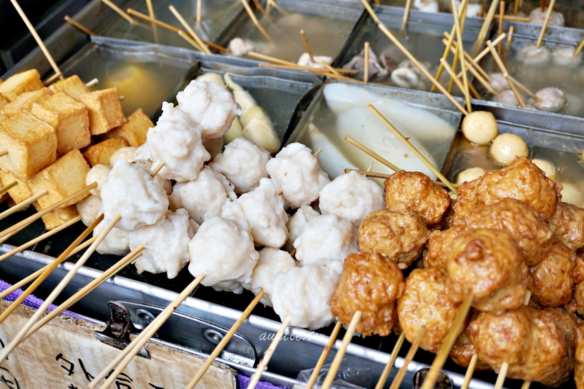 除了糯米大腸、香腸外,還有賣烤小管、干貝跟關東煮喔,東西真的蠻多的,雖然天氣熱,但還是點了幾串魚丸跟關東煮來吃看看。