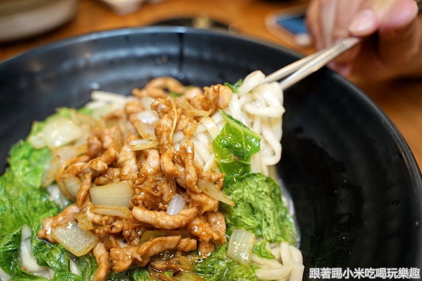 搶鍋麵85元,肉絲嫩嫩的有肉甜味,還有獨特的醬汁鹹香的洋蔥甜味,再帶點微微的酒香,跟著麵條一起拌完再吃很醒胃