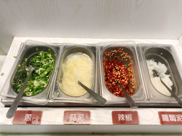 醬料部分,有提供四種基本的蔥、蒜泥、辣椒、蘿蔔泥可以自行調配。