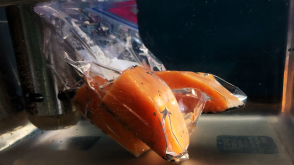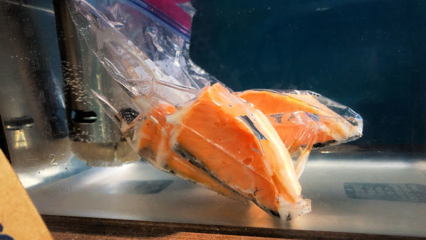 約20分鐘的時間,可以看到鮭魚外層顏色慢慢變化,溫水中的鮭魚漸漸的被煮熟,慢煮中的肉料理可以保有肉汁鮮甜及彈性,營養流失更少。每種肉的舒肥時間不一樣,有的肉品舒肥需要長達好幾十個小時。