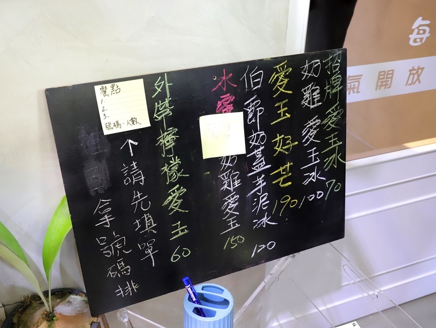大家來到店前,入口門旁 會有一個小黑板,上方寫著今日提供的愛玉、冰品項目;