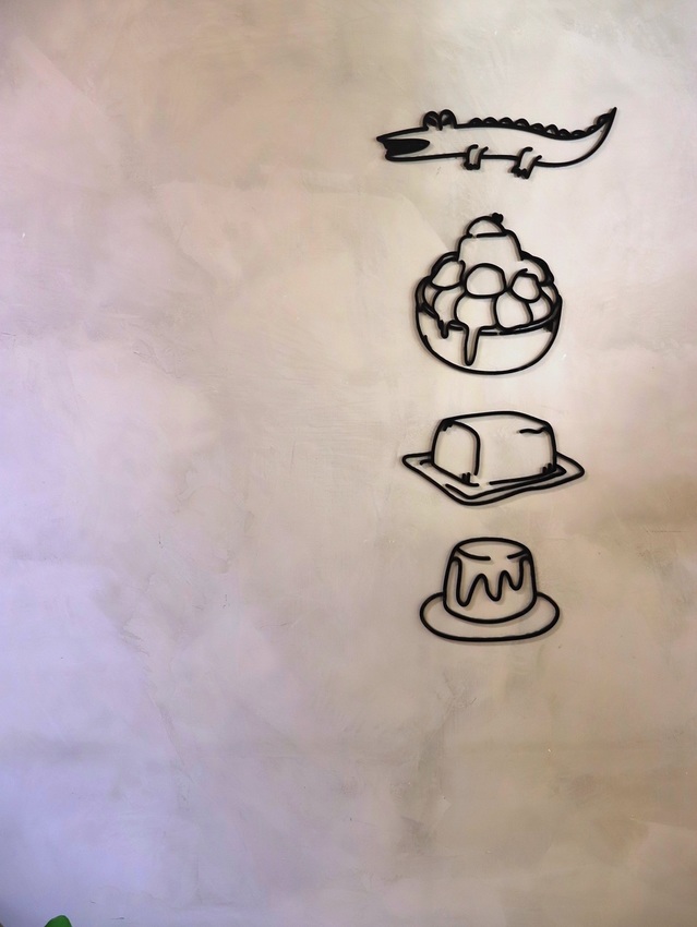 老闆和女友&設計師共同設計的手繪卡通圖,都有其獨特的象徵意義-鱷魚(很像愛玉的台語發音)、布丁水果冰(店家的招牌冰品)、愛玉(最初開店的唯一項目)、布丁(特別選用-台南在地職人手作焦糖布丁)