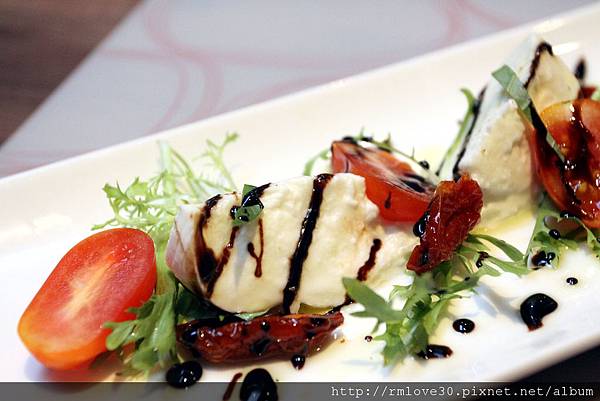 第一道是四選一的前菜,水牛馬芝拉起士搭配酪梨馬鈴薯