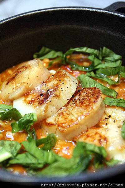 友人的單點主菜,干貝佐芝麻葉番茄燉飯(580元)