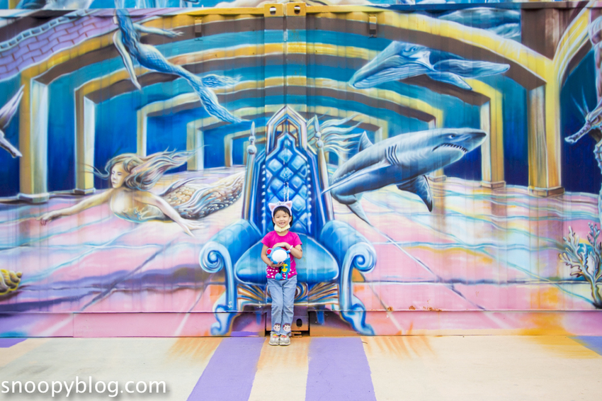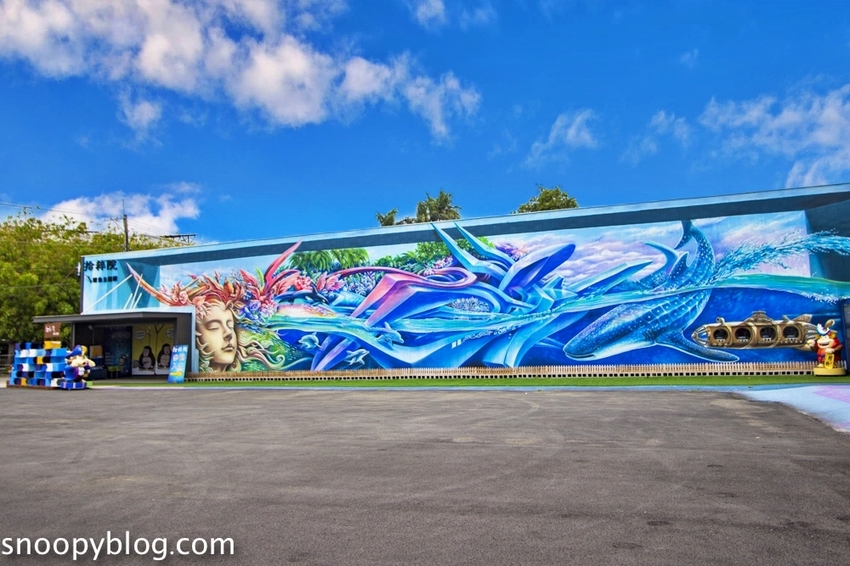 另一牆面上彩繪著海底世界,鯊魚、美人魚穿梭在海洋裡,