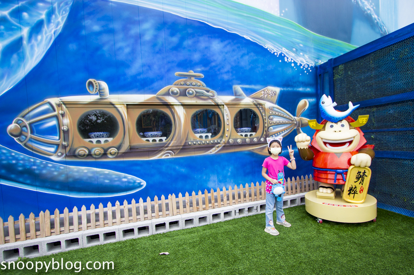 第三面牆彩繪了潛水艇潛水到海底探險,遇見了大鯨魚、小海豚…