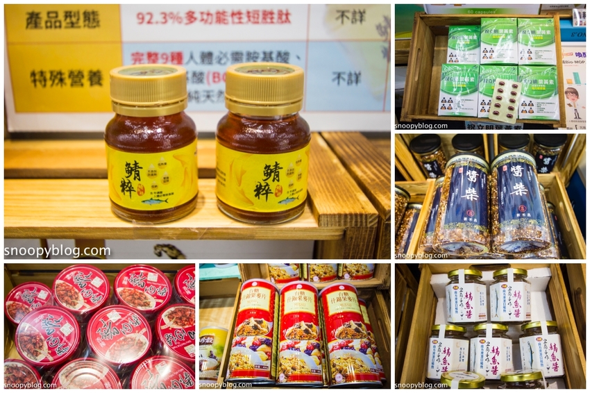 商品區販售鯖粹精、鯖魚罐頭、鯖魚油、鯖魚鬆、還有保健食品…