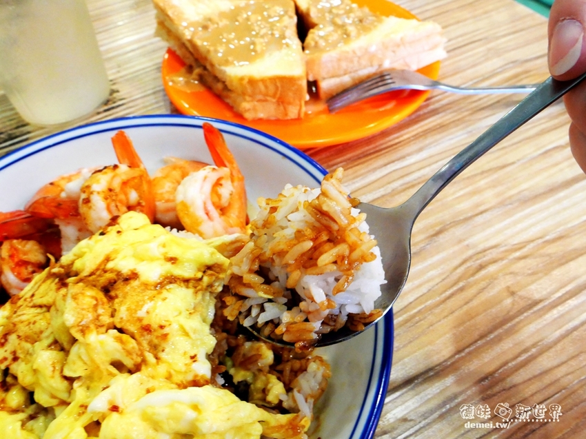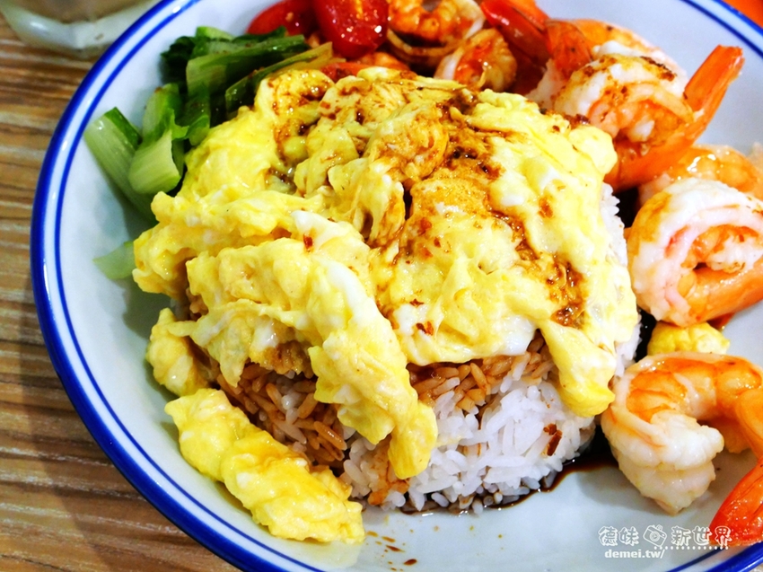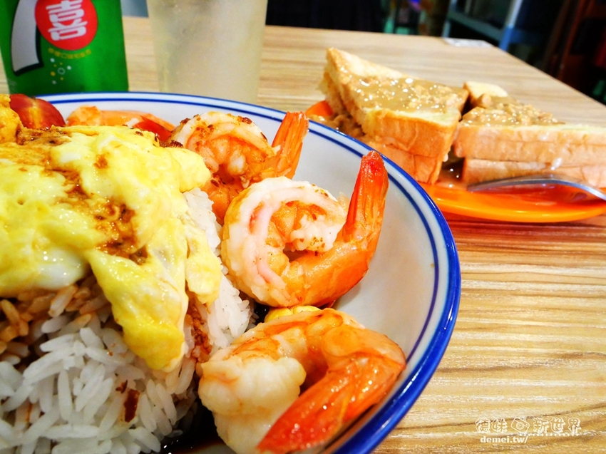 可選奶油滑蛋或太陽蛋,另搭有7-8尾乾煎去殼大蝦,