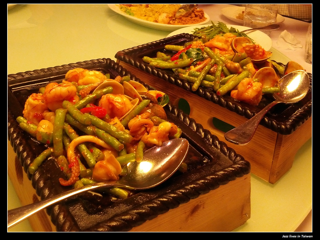 鐵板香辣海鮮, 很辣, 點小辣的我們, 吃起來還是頗辣的, 四季豆比海鮮多,
