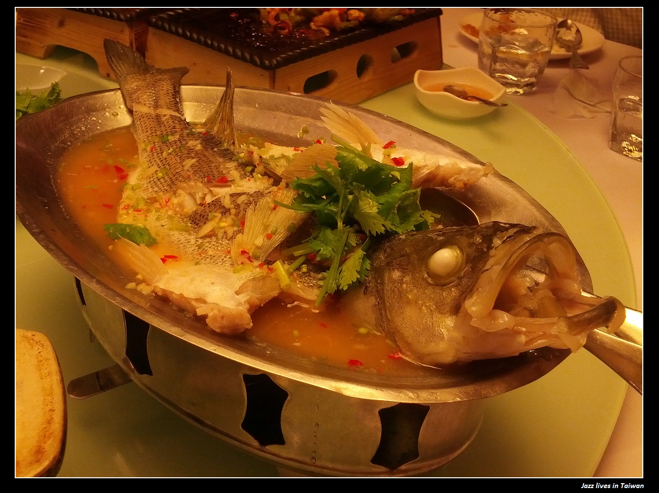 清蒸檸檬魚, 這也是泰國菜的招牌菜色之一, 不過我覺得鱸魚(應該是鱸魚吧?)肉質蒸煮後好像有點乾有點硬,