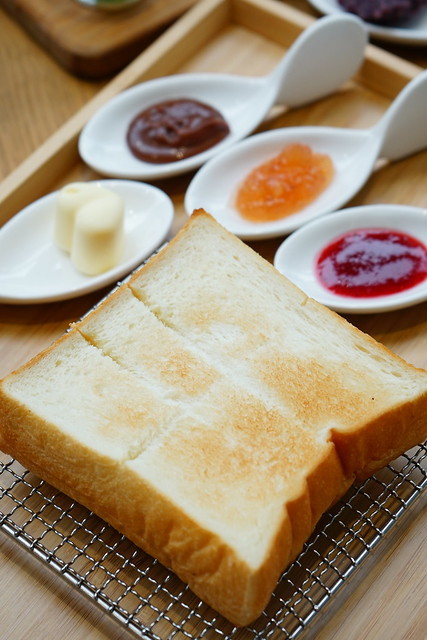 三款自製的果醬,巧克力、草莓、水蜜桃荔枝與日本北海道鮮奶油,這裡提供的是烤過的生吐司,但其實我覺得不切不烤手撕的口感更加細緻綿密