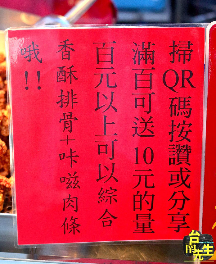 限量供應晚來吃不到的炸物攤,專賣排骨酥跟無骨肉條,當天備料現醃肉現裹粉現油炸,獨家醃料鹹香夠味,每天換新油不用回鍋油,還沒營業就有客人上門,老闆忙到手都沒停過攤位外觀:剛擺攤還在準備中就有客人上門炸好後放在玻璃櫃中,比較不會被髒空氣污染,注重衛生有加分;產品只賣兩種,香酥排骨與卡滋肉條每天換新油不用回鍋油當天備料現醃肉現裹粉現油炸,每天只準備固定量,賣完就沒了,想吃記得要趁早可以用LINEPay付款優惠活動每次炸好的量不會太多,幾乎買到的都是現炸起鍋沒多久,不會像有些店一次炸很多放著等客人買秤重販售可灑胡椒鹽與辣椒粉香酥排骨(有骨):裹粉不會太厚,炸好後非常酥脆,肉質Q彈,骨肉比例適中,不會像有些排骨酥都在啃骨頭卡滋肉條(無骨):獨家醃料鹹香夠味,鮮嫩中帶點嚼勁,完全沒有肉腥味,越吃越涮嘴店家資訊及價目表:https://www.mrtainan.com/2020/07/shanpin.html台南先生FB:https://www.facebook.com/mrtainan台南先生IG:https://www.instagram.com/mr.tainan