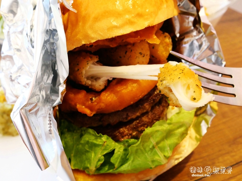 漢堡包、啤酒裹漿洋蔥圈、摩佐拉起司條、雙份4盎司澳洲純牛肉、無毒水耕生菜、蛋黃醬,