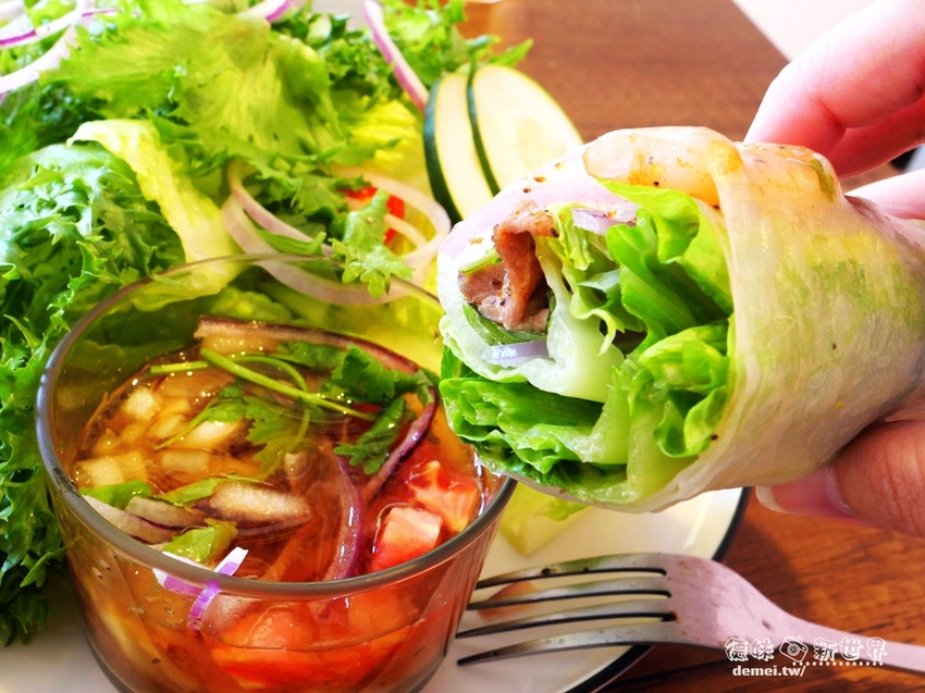 透明Q彈米卷內包裹著鮮蝦、梅花豬肉、鮮蔬,沾蘊點酸辣醬汁一同入口完全的泰式風味。