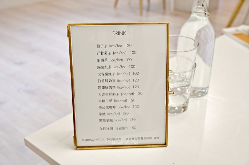 低消是一個人一杯飲料,咖啡茶飲還有每日特調,甜點都在甜點櫃裡,沒有另外的菜單,選好後櫃台點餐先結帳。