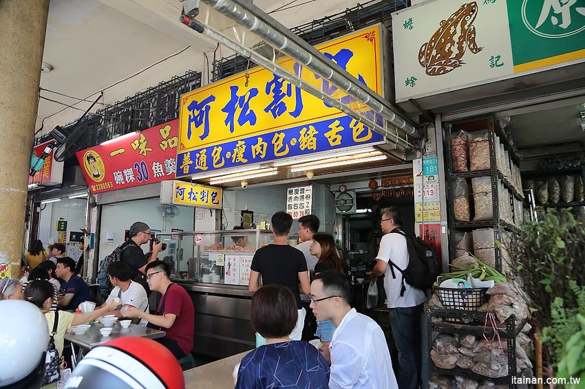 台南必吃的老店經典小吃之一~「阿松割包」,費時煮製的豬肉搭配酸菜丁、花生醬為組合,創造出獨具風格的豬舌包,再配上一碗清燙豬肉的清湯,鮮甜滋味讓人吃得津津有味。