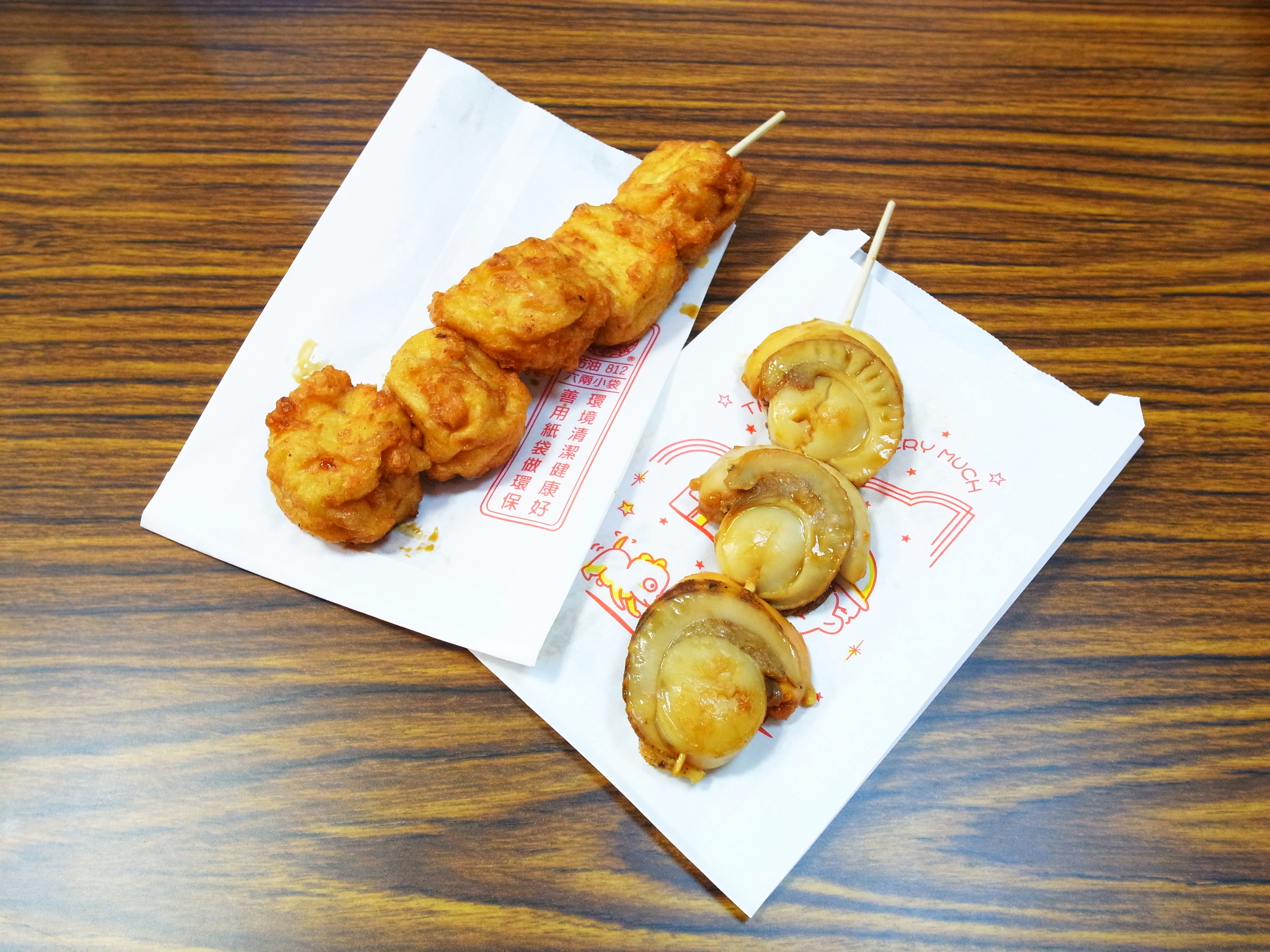 另外再從其他攤位買來蝦子一口天(NT.100)與烤干貝串(NT.150)。