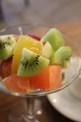 而我自己,因為很喜歡蛋料理,看到菜單上有義大利蛋餅,很好奇地點來嘗試,點了份蔬菜蛋餅90元,在加40元升級套餐,點了印度特濃奶茶與水果優格。我個人真的還滿喜歡早晨時光吃點水果,水果甜滋滋的水滋味,會讓早上的時間感到格外的幸福。淋上優格醬,真是好吃!