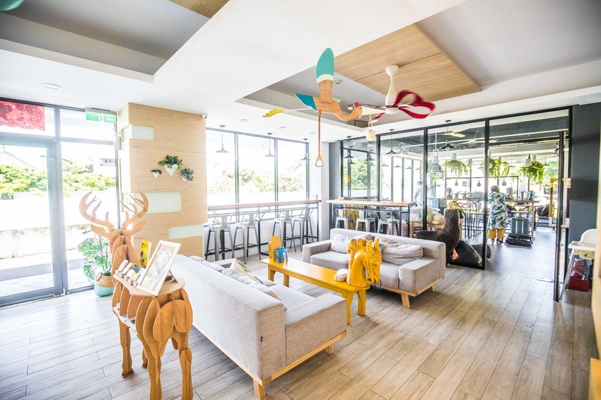 我們到達小琉球時是中午左右,入房時間是三點,可以先在行李放在一樓,在辦理入房手續的同時也可以詢問關於潛水或是周邊美食的問題,民宿主人都會很親切的解答,也可以在這邊預定浮潛的服務,門口處的小鹿書架也有許多小琉球的旅遊資訊可以參考,一樓公共空間走的是簡約的北歐風格,加上綠色植栽的裝飾,給人一種小清新的感覺