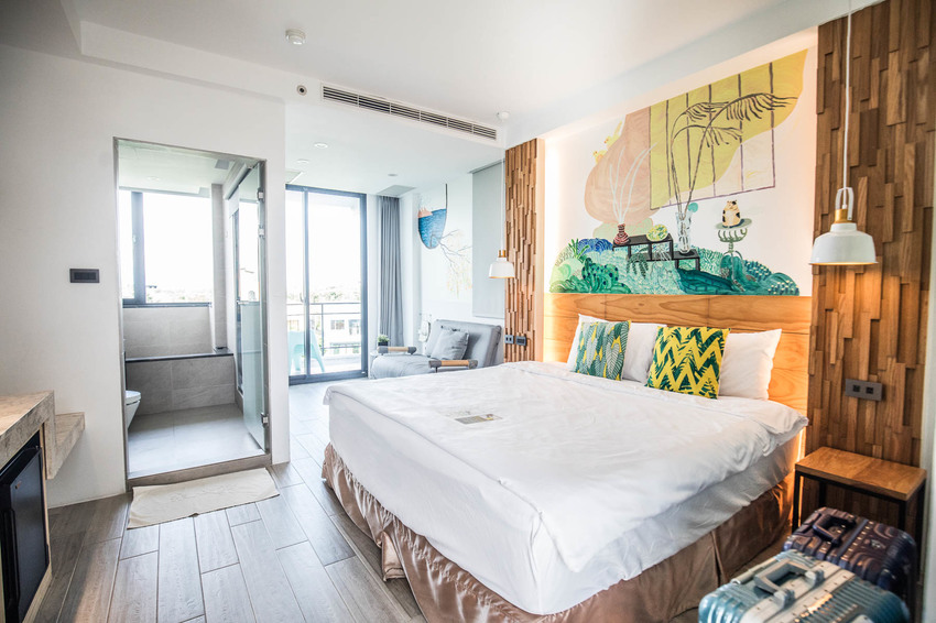 登登!房間開箱!我們這次入住的是精緻雙人房,房間坪數約8.5坪,有附一個陽台,此房型還有浴缸,走進來房間真的有滿滿的度假FU,白色系的北歐風格,牆面上也有小琉球的彩繪超可愛