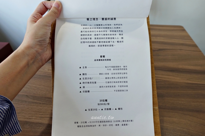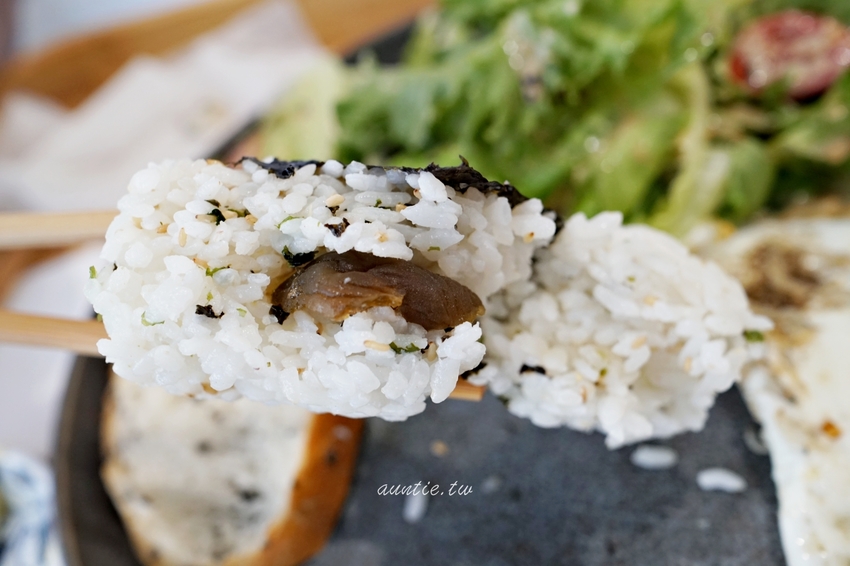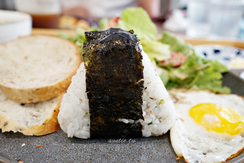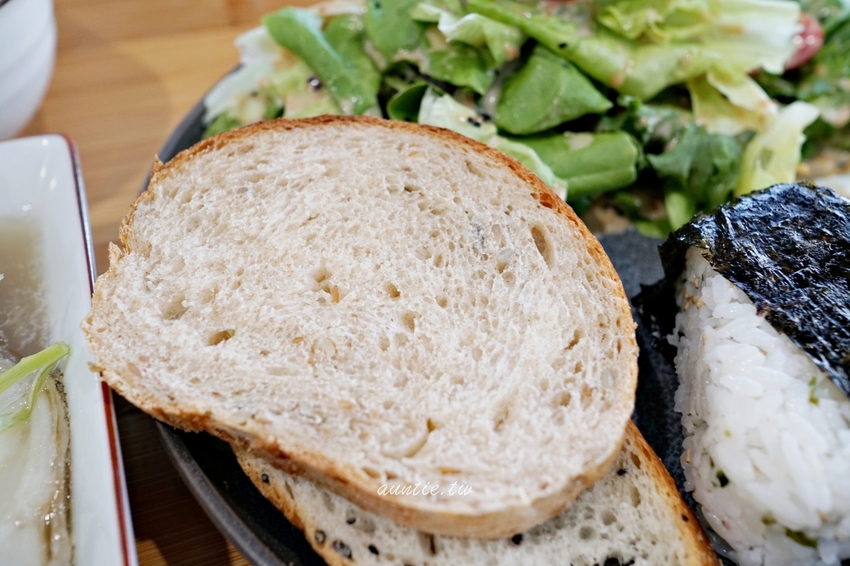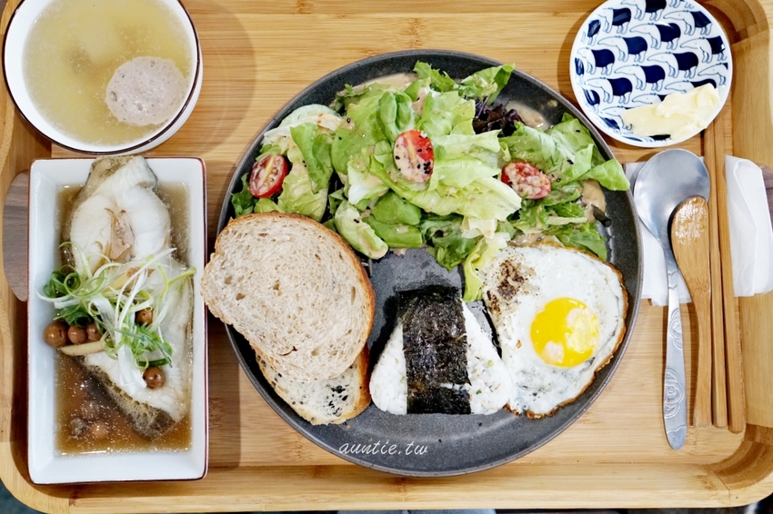 套餐多了生菜沙拉、吻仔魚太陽蛋、紫蘇海苔飯糰、自家麵包、還有有料的湯。一開始對套餐沒什麼興趣,不過朋友想吃鹹的就點下去,沒想到端上來的比想像中豐富很多。