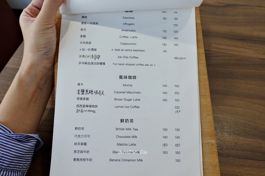 選好餐點後到櫃台結帳,飲用水自行取用,店裡有低消,每人一份餐點或飲料。飲料選項不少,看到有最愛的西西里檸檬咖啡就點下去,黑板上也有鹹食套餐喔!