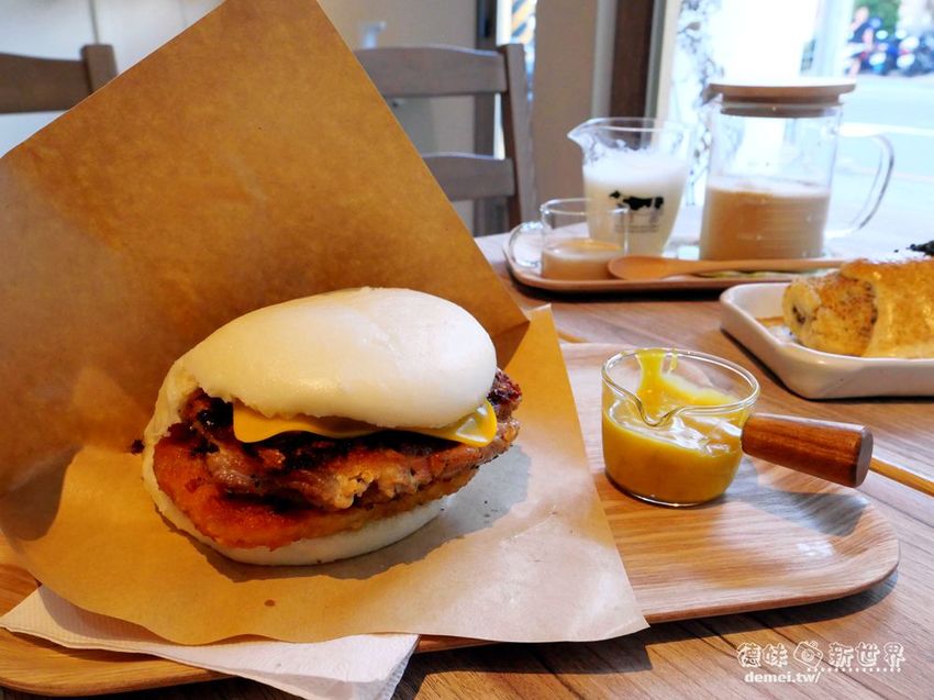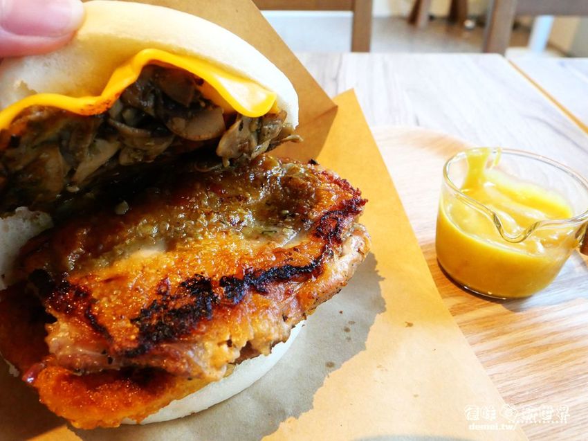 由刈包餅皮、起司片、炒蘑菇、香煎雞腿肉、薯餅堆疊而成,搭配上店家自製的蜂蜜芥末醬。