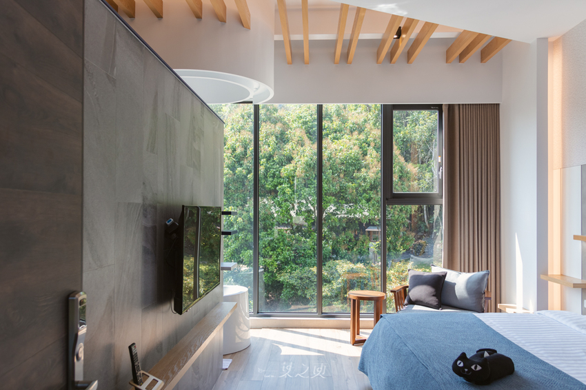 友人 艾方妮的遊樂場 則獨自入住 Bubble 泡泡雙人房,開放式的空間設計與大片落地窗讓視線更開闊,我特別喜歡這個挑高空間,天花板和外頭有同樣的木條設計,且落地窗似乎讓陽光更加明媚了。