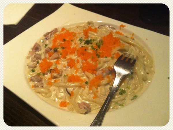 應該很少人看到烏龍麵做成像義大利麵的樣子吧?! 因為DOZO是創意和風料理,所以當然會有一些出人意表的菜,這道義大利白醬烏龍麵表面傘了好多的蝦卵..