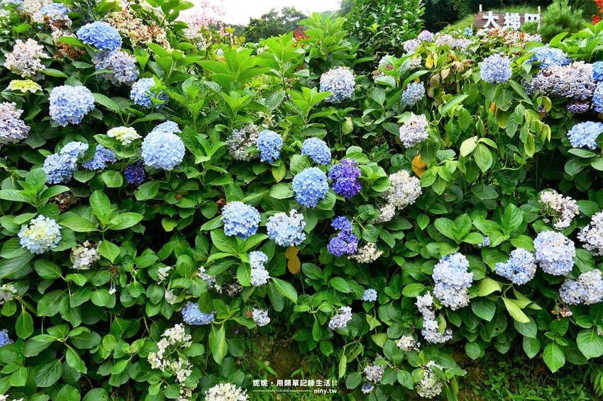 往花田一區那邊看一下發現凋謝的程度比二區還要嚴重,所以我們又回到二區賞花拍照,從二區一路走來都只看到藍色繡球花,走到中間就看到也有紫色的,深紫色與淡紫色的繡球花交錯著點綴著綠色的葉子欉,覺得蠻可愛的。