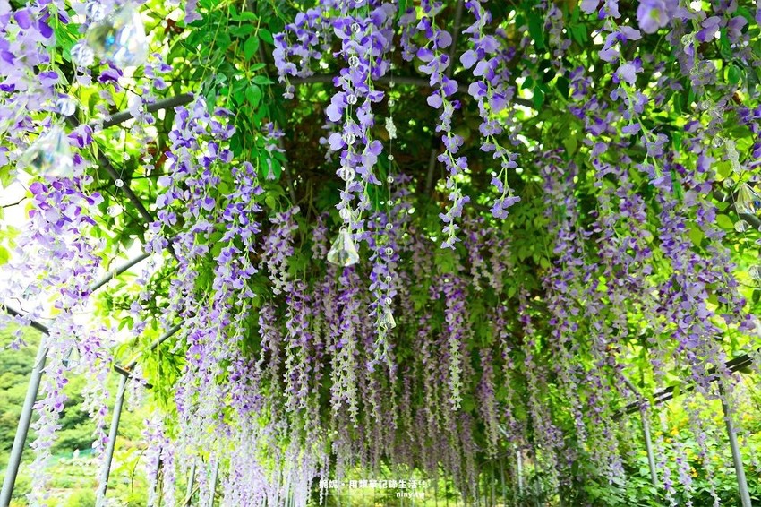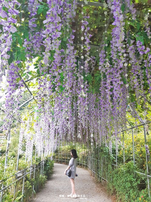 接近花田一區入口處有個爆美的紫藤花瀑布隧道,雖然近看發現是假的哈哈哈哈哈,不過搭配垂吊的水晶裝飾,一整條隧道變得很夢幻,除了繡球花外,這條隧道也是許多人拍照打卡的人氣景點之一喔!!