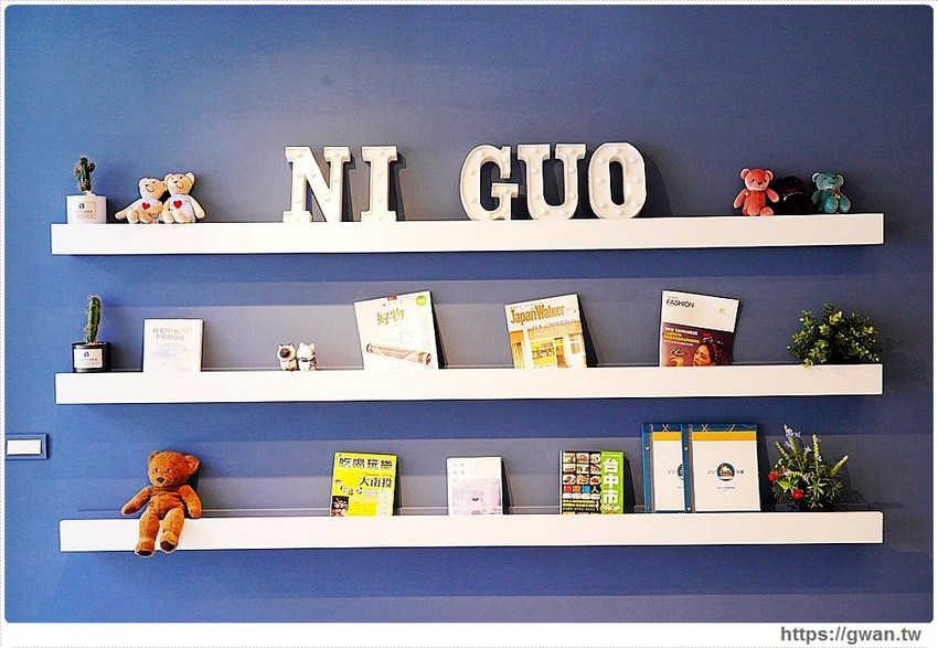靛藍色牆面讓人感覺放鬆,上頭擺的旅遊書都能翻閱