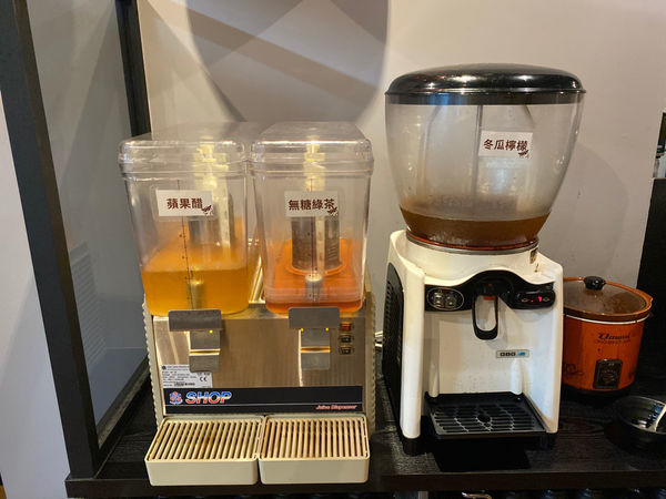 自助區飲料有無糖茶、解膩的蘋菓醋、夏天開胃的檸檬冬瓜