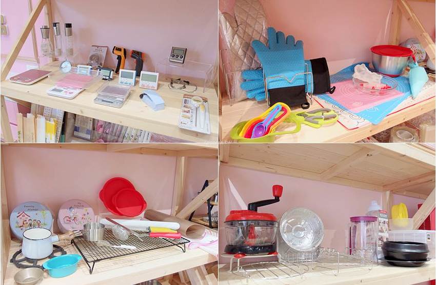 放眼望去就有烤盤、矽膠手套、揉麵墊、溫度計、圓型圈、不鏽鋼量杯、吐司切片器、電動攪拌機、電子秤、鬆餅機、砝瑯鍋等,大大小小的廚房烘焙工具都可以直接買到。