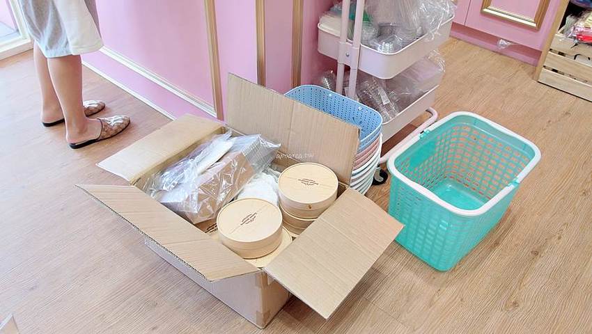 進門一樣是粉色的販售空間,搭配木質層架的商品擺設看了好舒心。雖然門市看起來規模不大,但款式多樣色彩豐富的專業包材應有盡有,烘焙魂看到這些形形色色的食品包裝材料就跟餐盤控看到喜歡的鍋碗碟盤一樣,會忍不住失心瘋什麼都想買,光想像自己製作的糕點可以裝入這些質感包材,心情就莫名愉悅起來XD!