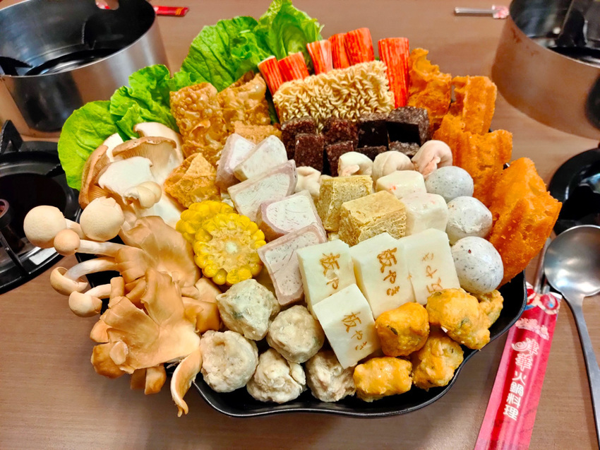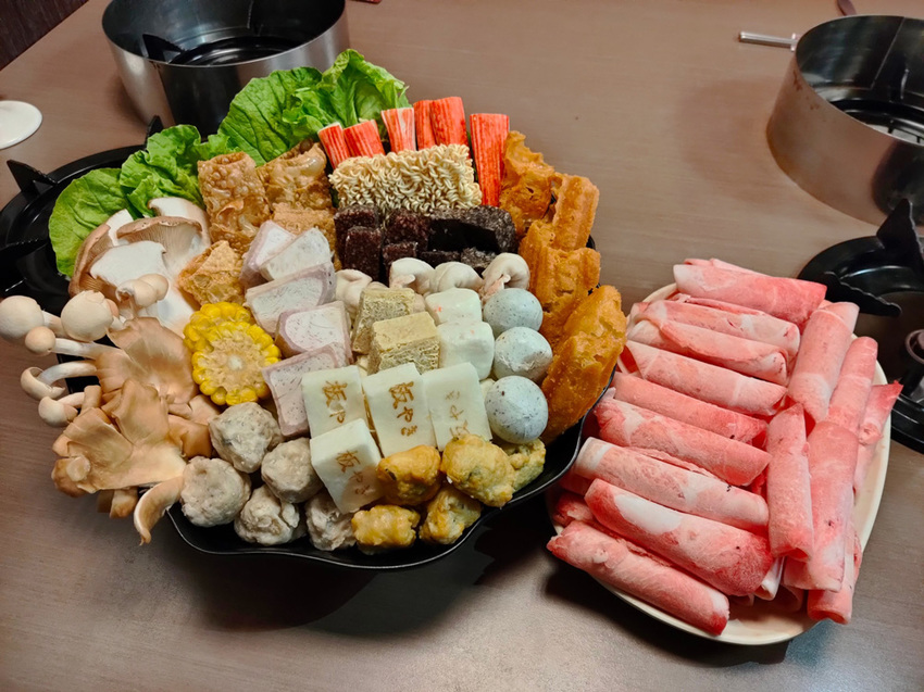 先看看這個誇張的菜盤;有別以往北安店所推出的菜盤,裡面還加了不少原菜盤裡面沒有的火鍋料、老油條、杏鮑菇、秀珍菇、白精靈菇、科學麵…等,整個菜盤根本只能用「滿溢」來形容啊!