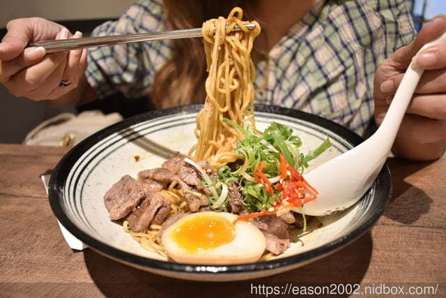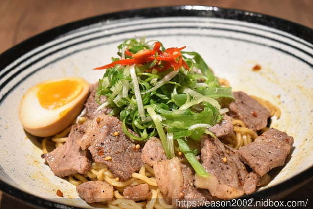 炙燒PR黑牛拌麵,花椒、朝天椒、青海椒自製的麻辣口感,與花椒牛油相互攪拌後,最上層的日式拉麵與蔥花香結合,乾拌麵的辣度,真的可以辣的你不要不要der……會讓你一邊吃,一邊流鼻水。