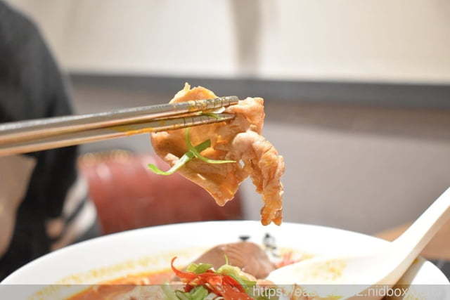 麻辣梅花豬,以洋蔥、牛大骨、牛小排,每日細火慢熬製而成的麻辣湯頭,喝起來又麻又嗆,帶點些微的洋蔥原始鮮甜,湯頭精心熬煮,拉麵口感Q彈,內容物也很豐富,帶著少量的油脂梅花豬肉,吃起來口感,軟嫩不乾柴,還有麻辣鍋物必備的鴨血,喜愛吃辣的饕客,絕不能錯過。