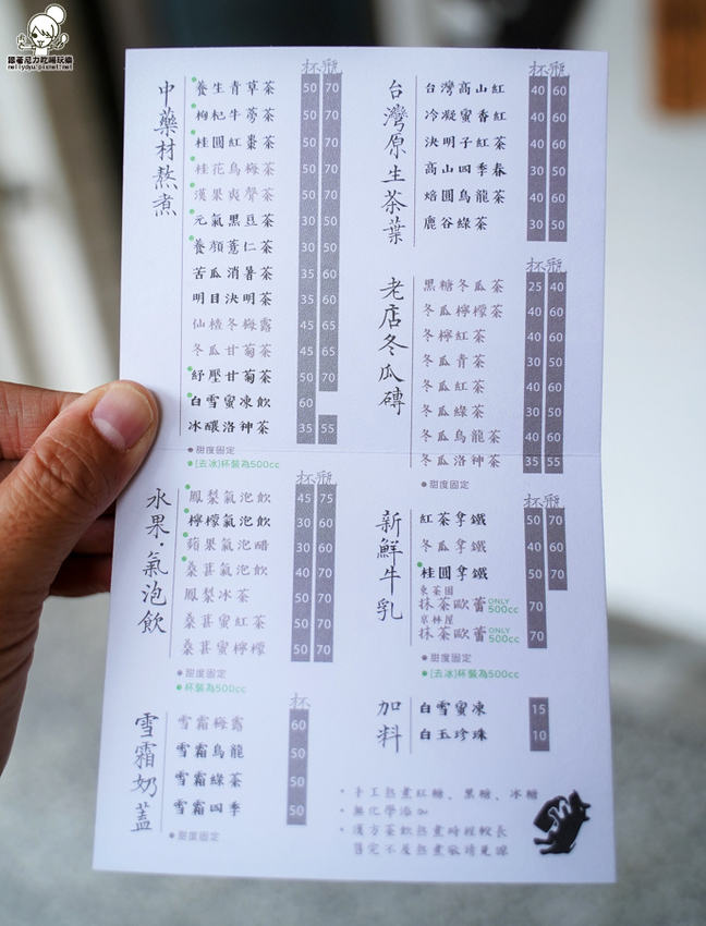 中藥材熬煮、台灣原生茶業、老店冬瓜磚、水果氣泡飲、新鮮牛乳、雪霜奶蓋等系列