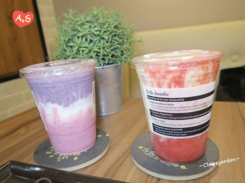 店家主打果昔綠色植披再放入一杯充滿水果的果昔