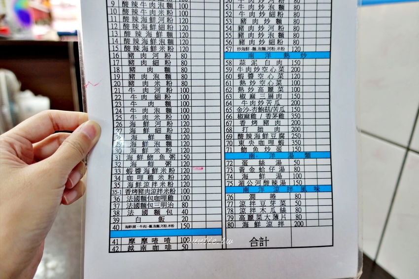 餐點種類很多,還有些是寫在櫃檯前的黑板上,湄公河南洋美食是越南料理,還有法式麵包、越式春捲等等,飯麵米粉通通有,建議可以點海鮮,因為這次吃到麵裡的海鮮料,真的很新鮮!