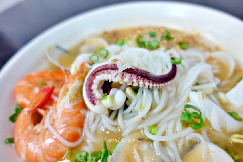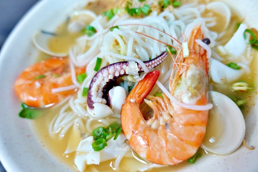 接近海港的關係,鮮蝦、花枝、蛤蠣等海鮮配料真的很新鮮,蛤蠣肉真的好飽滿,蝦子、花枝真的都好吃,酸辣味道蠻夠的吃起來真的很開胃,因為本人重口味啦,如果可以再酸辣一點會更好,一旁有辣椒醬可以自己加,後來加了之後真的是吃得很過癮,湯頭很不錯,好吃!