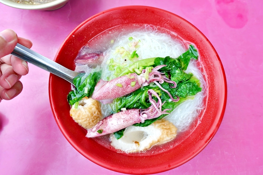 裡頭有三隻小卷,加了芹菜,湯頭味道挺淡的,小卷很新鮮,口感脆脆蠻鮮甜的,米粉是細米粉,跟台南的粗米粉湯不太一樣,味道就是中規中矩嚕!