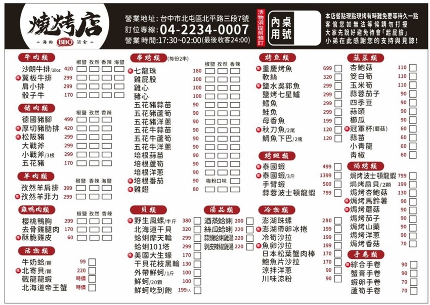 台中燒烤店菜單