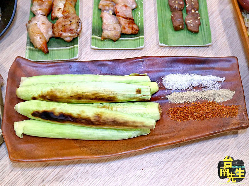 玉米筍:帶殼玉米筍洗淨後直接上烤台,鎖住鮮甜滋味與營養成份,單純搭配鹽巴、胡椒鹽、辣椒粉三種調味料就很對味