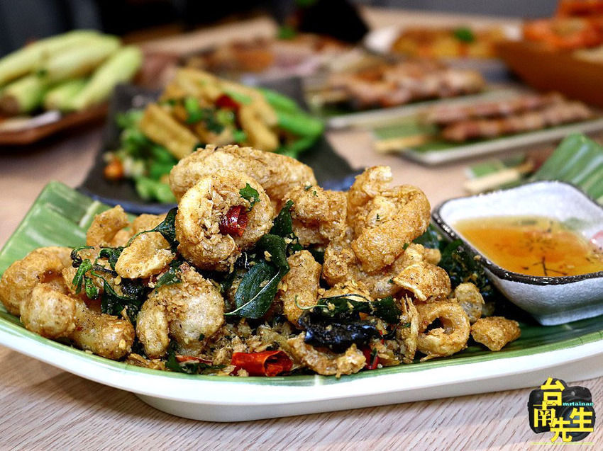 泰式炸豬皮:將豬皮炸過再搭配椒鹽炒過,吃起來居然比餅乾還酥脆,越吃越涮嘴,重點即使放冷也完全不油膩