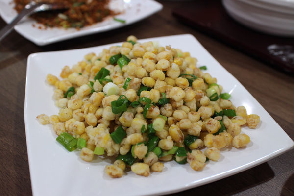 桂花玉米$100 珠圓玉潤的玉米跟桂花沒關係,應該是白裡透著淡淡黃,形似桂花,口感很新奇,玉米粒均勻裹上薄薄粉漿,先炸過再加青蔥爆炒,香甜玉米加上酥脆口感,是必點!