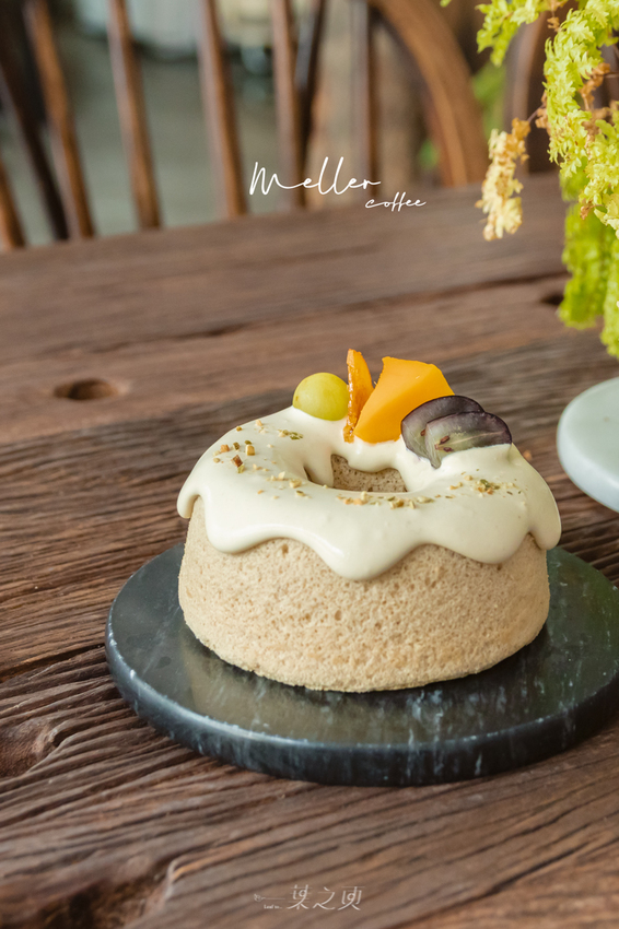 雖然現在比較常看見類似呈現的四吋小戚風,不過 Meller 墨樂咖啡提供了多種口味,其中開心果更是讓我眼睛為之一亮。特別喜歡開心果入甜點的香氣,還特地問了店家:「請問開心果口味是只有鮮奶油部分、還是蛋糕體也是開心果口味的呢?」「蛋糕體也是喔!」這讓我不假思索立刻決定就是它了(笑)