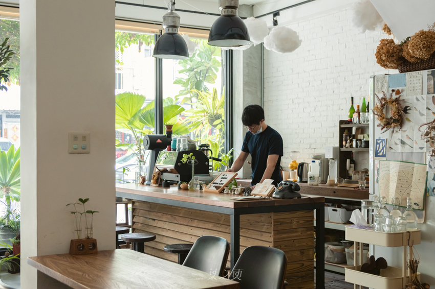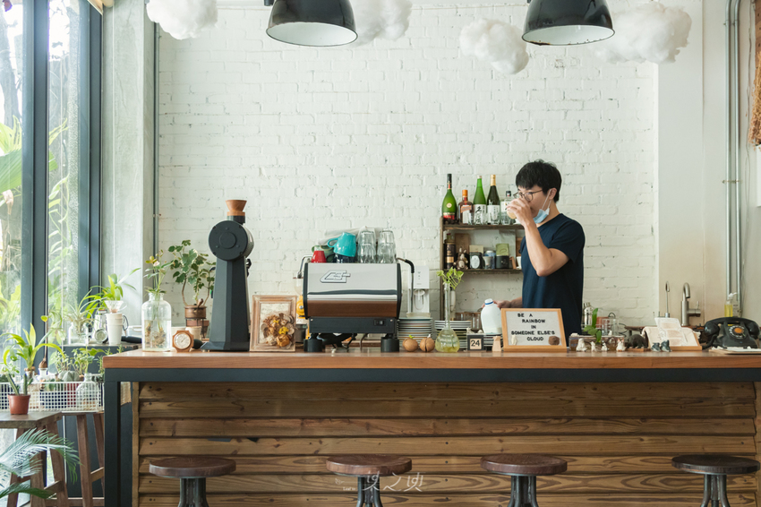 我特別喜歡落地窗旁的吧檯工作區,無論在店裡哪個角落,都可以看見小小的吧檯,透過葉片灑下來的陽光,襯著一片綠意和潔白;頂上一團團的棉花雲朵,似乎將總是給人晴天印象的台南好天氣,悄悄地延伸到這個同樣令人感到舒適的空間裡。